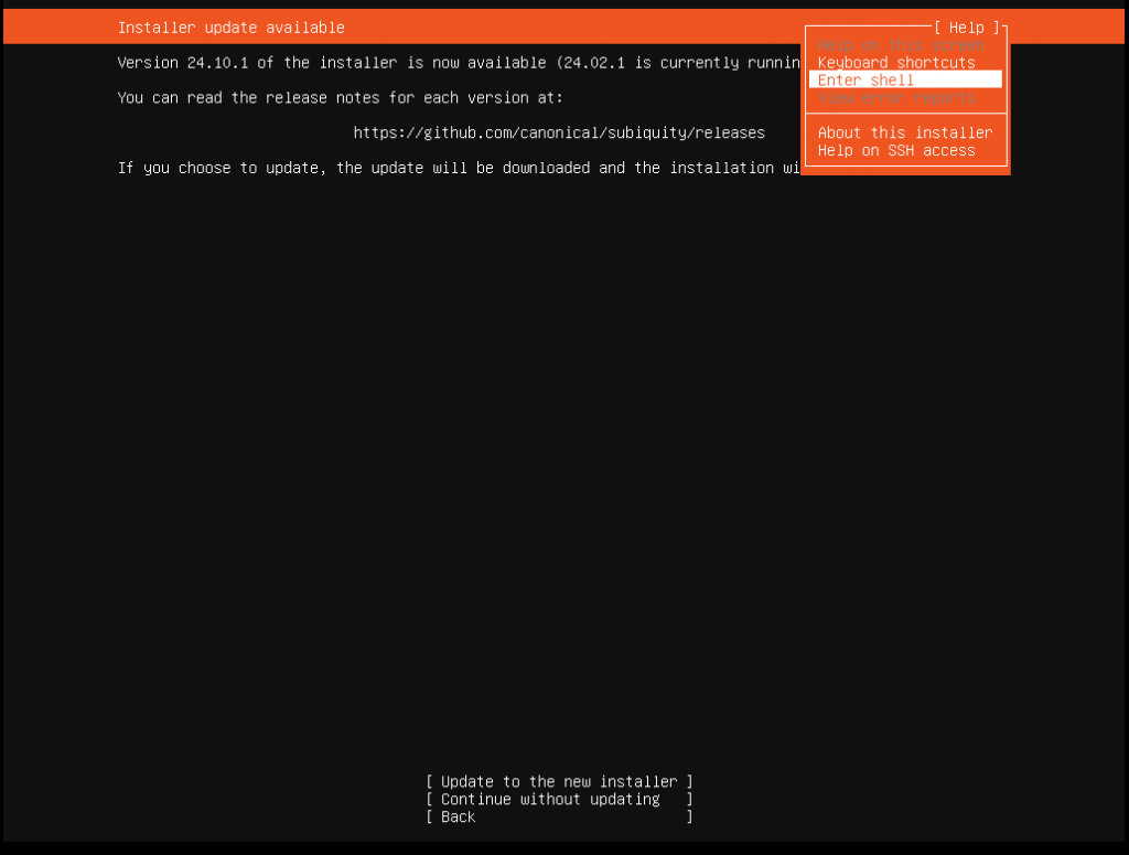 After that, you need to select a language. After selecting it, a window will open with a suggestion to continue without updating. I prefer immediately switching to an SSH connection and continuing the MobaXterm installation. Using the TAB key, select Help and select the Enter Shell option. Changing the password for the user called “installer”.