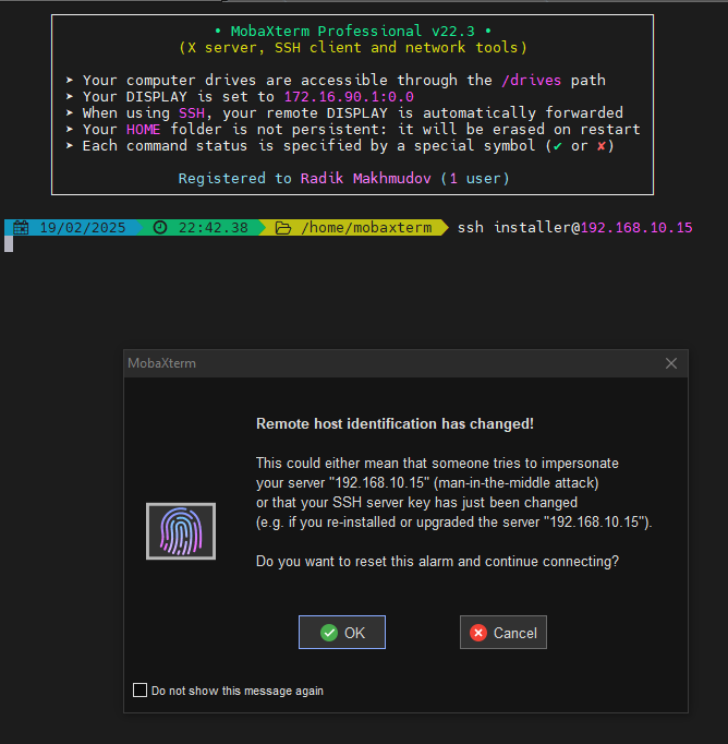 Launching an SSH session by using the command “ssh installer@192.168.10.15“, I confirm the connection. Now, the installation process is in my console.