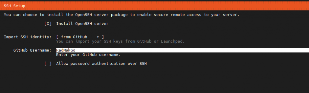 We indicate that we want to install an SSH server and take the public key from GitHub or Launchpad, if available; if not, leave “none.” In my case, I have a public key on GitHub, and I immediately refuse to use SSH password access.