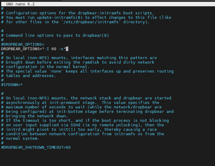 Making changes to the configuration file /etc/dropbear/initramfs/dropbear.conf and adding the option DROPBEAR_OPTIONS=”-I 60 -s”