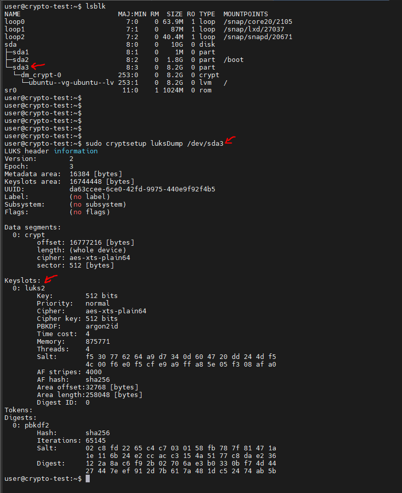 Looking at the disk partitions and checking the parameters of the existing LUKS volume.