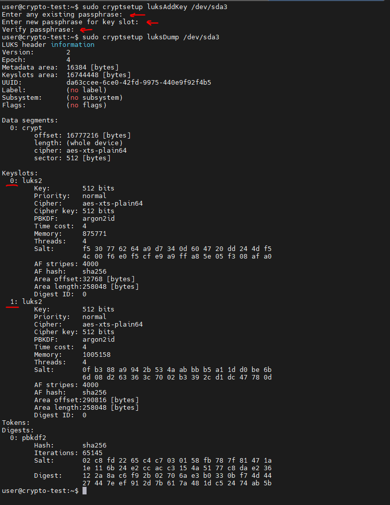 Backup access: Always leave one secure key or password in case of failure. Security: When using key files, ensure they are stored in a safe directory. PBKDF settings: LUKS2 uses argon2id by default in new versions of Ubuntu but can be reconfigured. That‘s it. The system is ready.