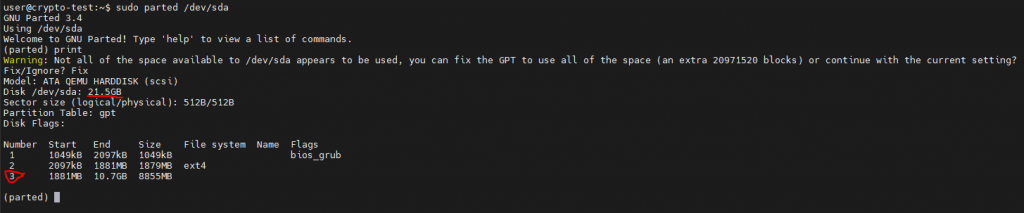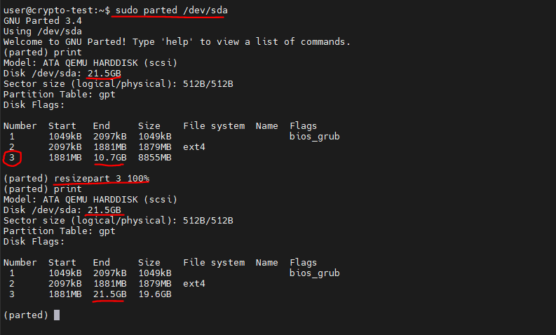 9. We need to increase the size of the sda3 partition (in our case, it goes under number 3), on which the encrypted disk partition is based, giving it all the free space, i.e. 10G, for this, we write the command: