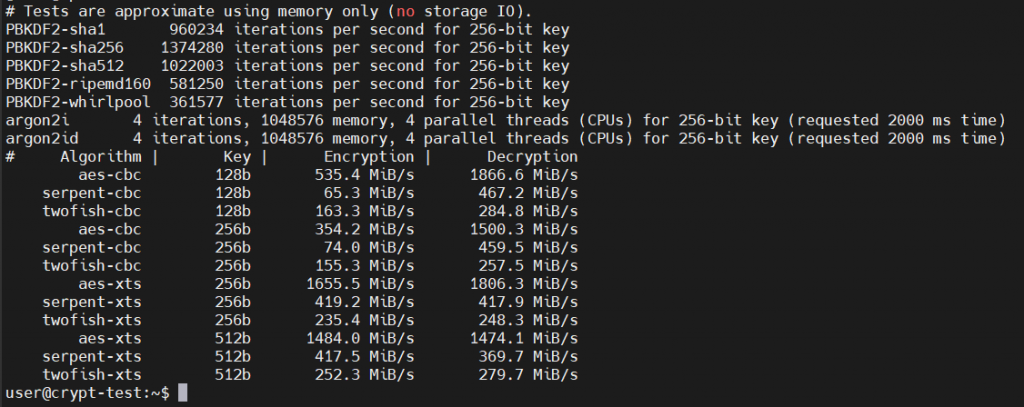 If you’re interested in benchmarking (performance test) LUKS/cryptsetup, use the command:
