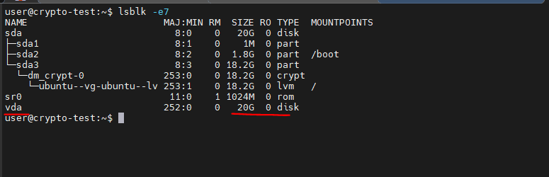 Let’s say we added a 20G disk that needs to be encrypted and configured so that it is automatically mounted by the system using a key file. (it is assumed that the system is also located on an encrypted disk)