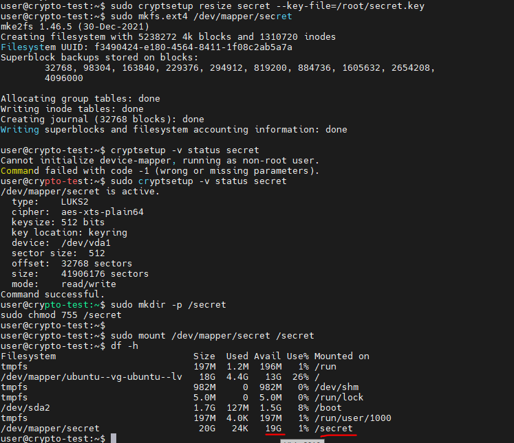 sudo cryptsetup resize secret --key-file=/root/secret.key