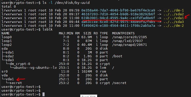 sudo cryptsetup luksOpen /dev/vda1 secret  --key-file=/root/secret.key